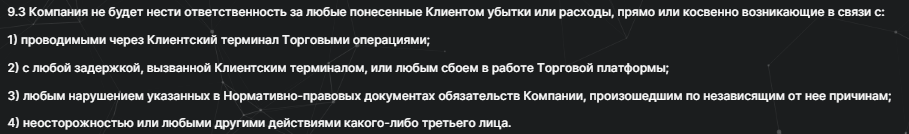 Администрация компании не несет никакой ответственности за потерю денежных клиентских средств. Поэтому работа с этой организацией сопряжена с огромным риском потерять все свое благосостояние.
