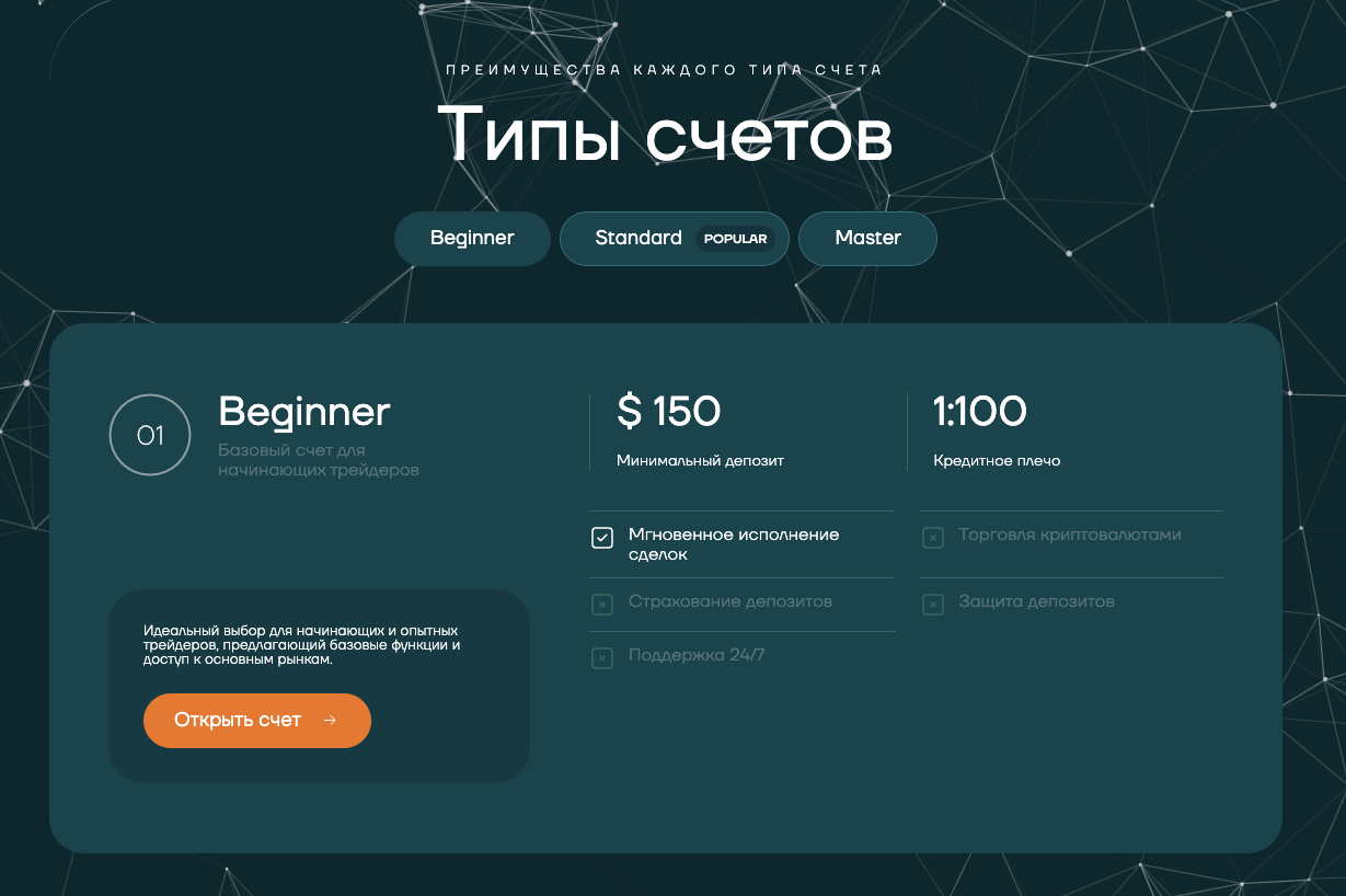 Чтобы начать торговать на платформе Acwebcorp, нужно внести на счет минимум 150 долларов. С таким балансом клиенту открывают доступ только к мгновенному исполнению сделок и кредитному плечу 1 к 100.