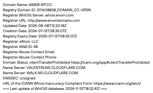 Чтобы определить, когда валютный брокер Acwebcorp начал работать, мы запросили данные домена aweb rp cc из сервиса Whois. Выяснили, что он был зарегистрирован в середине июля 2024-го года.