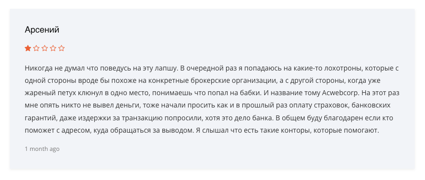 По результатам обзора мы пришли к выводу, что брокер Acwebcorp – это с высокой вероятностью мошенник. Вот конкретные факты, которые свидетельствуют в пользу выдвинутого обвинения: