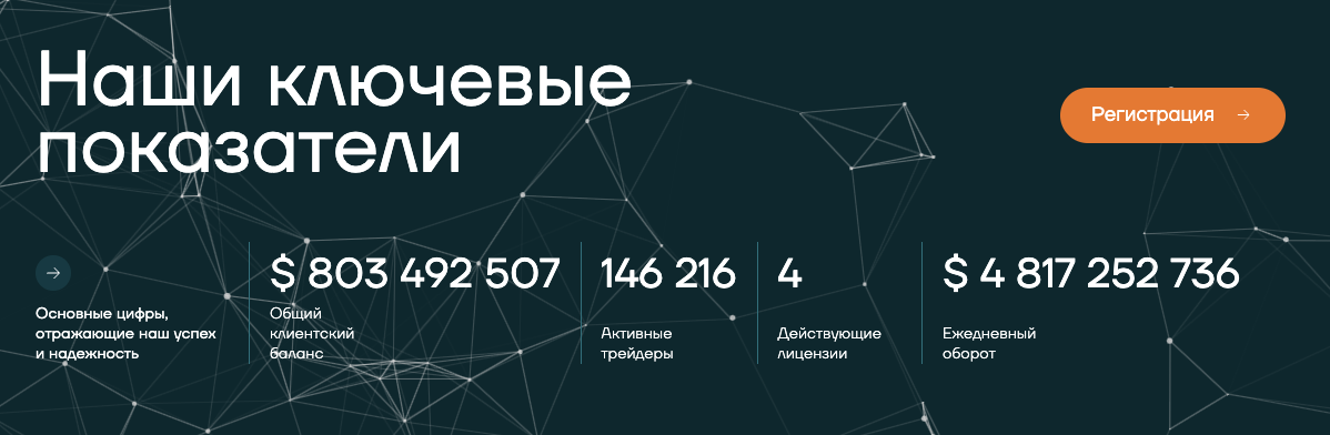 На главной странице сайта брокера есть блок «Ключевые показатели». В нем указано, что на платформе активно работают 146 тысяч трейдеров, которые держат на балансе около 800 миллионов долларов. Подтверждений этим фактам не приведено. На ресурсе отсутствуют ссылки на отчетные документы организации.