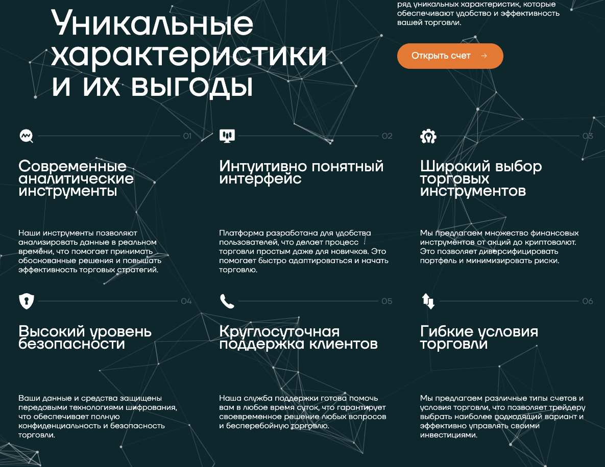 В качестве преимуществ брокера приведены: безопасность, гибкие торговые условия и круглосуточная поддержка клиентов. Но описания этих достоинств скупы и размыты. Например, указано, что безопасность клиентов обеспечивает шифрование данных. Но сейчас это делают абсолютно все сайты, даже маленькие блоги. И выставлять это в качестве преимущества странно.