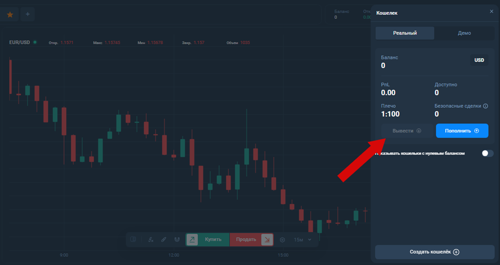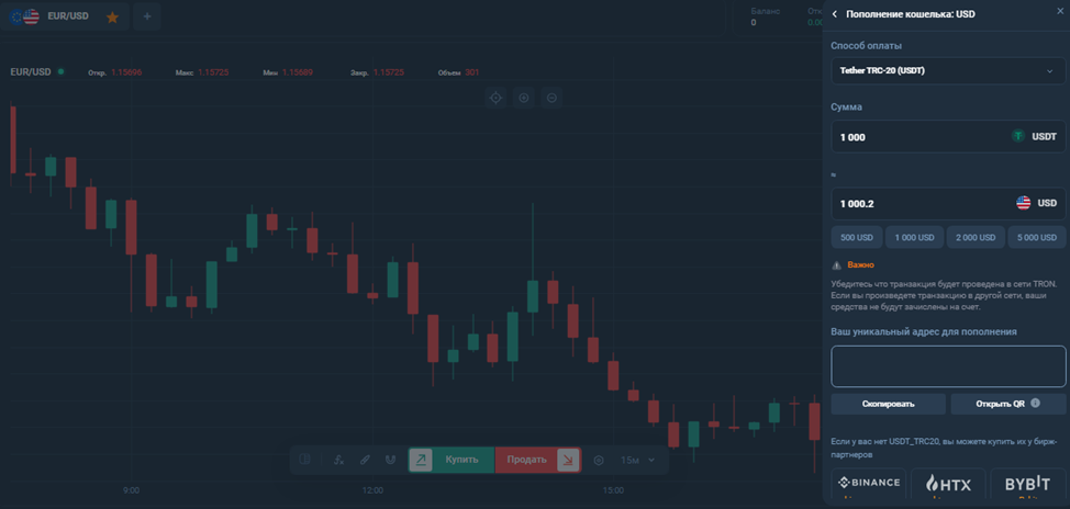 Для начала торговли необходимо внести депозит. Деньги принимают только криптой или на карту физического лица. Такие методы не позволяют отследить конечного получателя, а, соответственно — лишают клиента возможности на возврат уже отправленных средств.