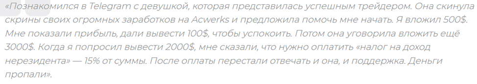 Биржа Acwerks проработала несколько месяцев, получив только негативные отзывы. Все клиенты жалуются на проблемы с выводом денег. Для разблокировки функции менеджеры требовали оплатить вымышленные сборы. Но даже после закрытия всех озвученных долгов, человеку отказывали в выплате и блокировали доступ к личному кабинету на сайте.