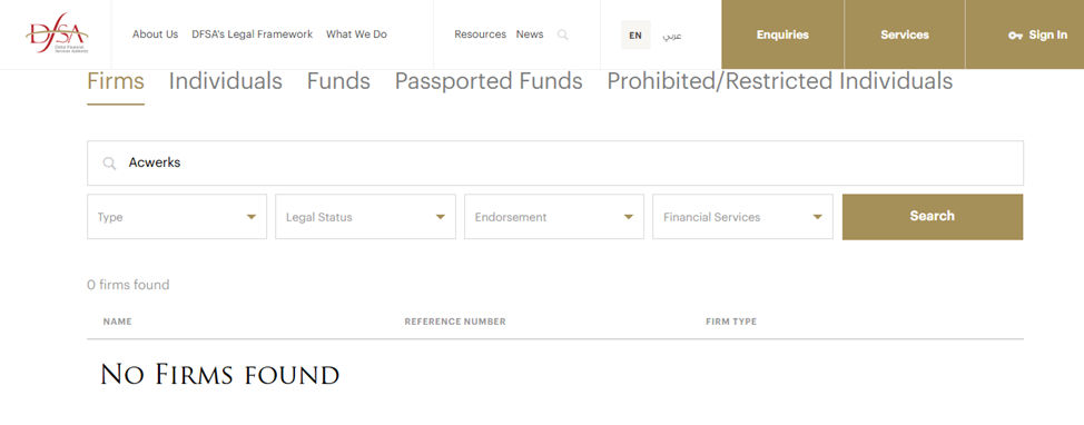 Организаторы платформы заявляют, что работают легально и под надзором сразу 4 регуляторов. Но фактически в оферте нет регистрационного номера компании, а все ссылки из раздела «Лицензии» ведут на поддельные сайты. В базе данных FCA, CSSF, DFSA и VFSC нет никаких упоминаний Acwerks или фирм с похожим названием.