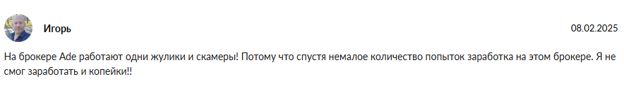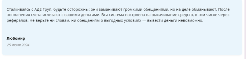 Утверждение, что Ade Group — мошенник, возникло из-за того, что клиенты могли пополнить депозит, но не смогли вывести деньги.