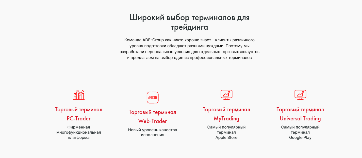 Ade Group Trading предоставляет доступ к 4 торговым платформам: