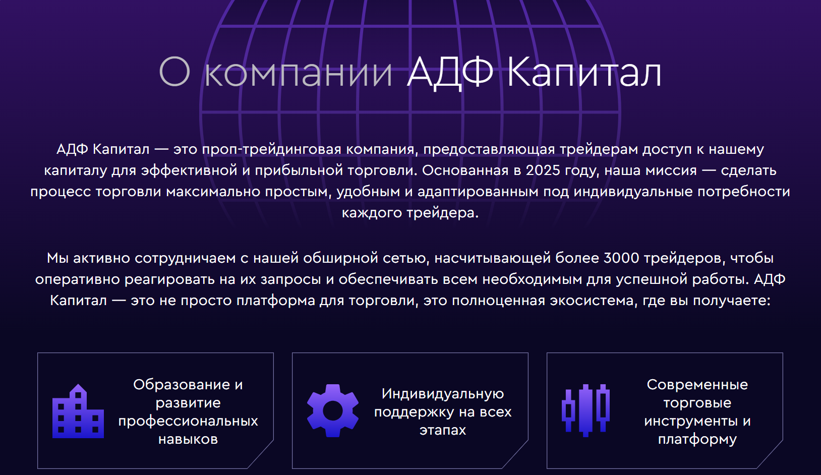 «АДФ Капитал» открывает трейдерам доступ к собственному капиталу компании для проведения торговых операций на финансовых рынках. После прохождения регистрации, базового обучения и подтверждения навыков трейдер получает торговый лимит. Он может достигать миллиона долларов в зависимости от результатов.