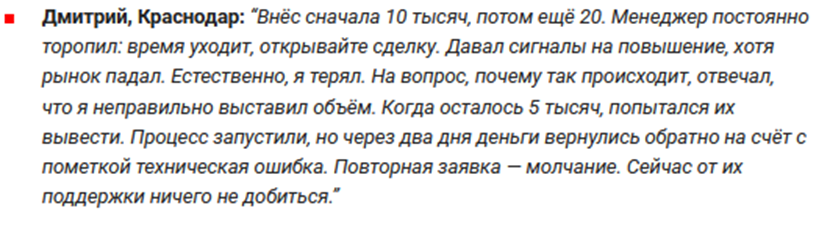 Есть негативные отзывы и на действия менеджеров Afitaustin. Так называемые аналитики сначала уговаривают внести большую сумму на счет, затем дают неправильные сигналы для слива капитала. Вывести остаток уже не получается, клиенту начинают чинить всяческие препятствия.
