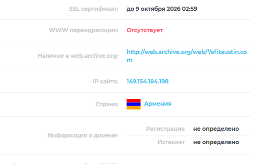На сайте Afitaustin com нет информации о компании-владельце, лицензиях и регулировании. Дата основания 2017 также ничем не подтверждается. Информация о регистрации домена скрыта, но удалось узнать, что он был открыт через Ip адрес Армении. Архивные данные показывают, что Afitaustin com впервые появился в 2021, но никакой деятельности на платформе не было. Первые признаки активности видны только в 2026.