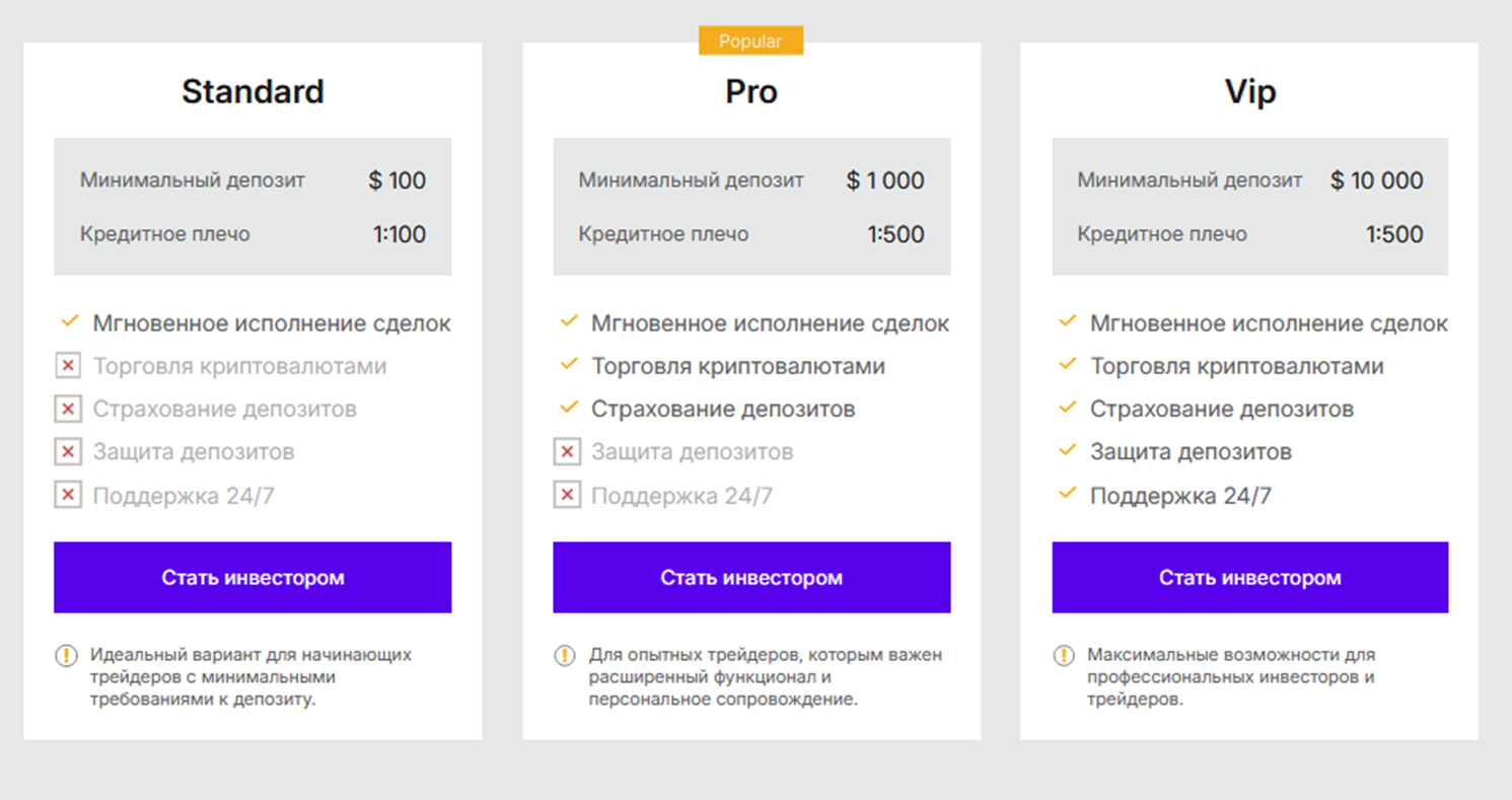 Но условия прописаны очень плохо, никаких конкретных данных нет. Информация по вариантам счетов также недостаточная. Сказано только о размерах минимального депозита, кредитном плече и наборе услуг. Наименьший вклад предлагается для плана Стандарт – 100 у.е., из преимуществ клиенту доступно мгновенное исполнение ордеров. Для тарифа ПРО размер депозита составляет уже 1000 у.е., ВИП – 10000 у.е. О комиссиях, оплате по страховкам и за обслуживание счета ничего не сказано.