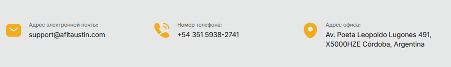 Вопросы вызывают и указанные контактные данные. Номер телефона +5435159382741 проверить не удалось. Электронный адрес техподдержки support afitaustin com оказался недействительным.