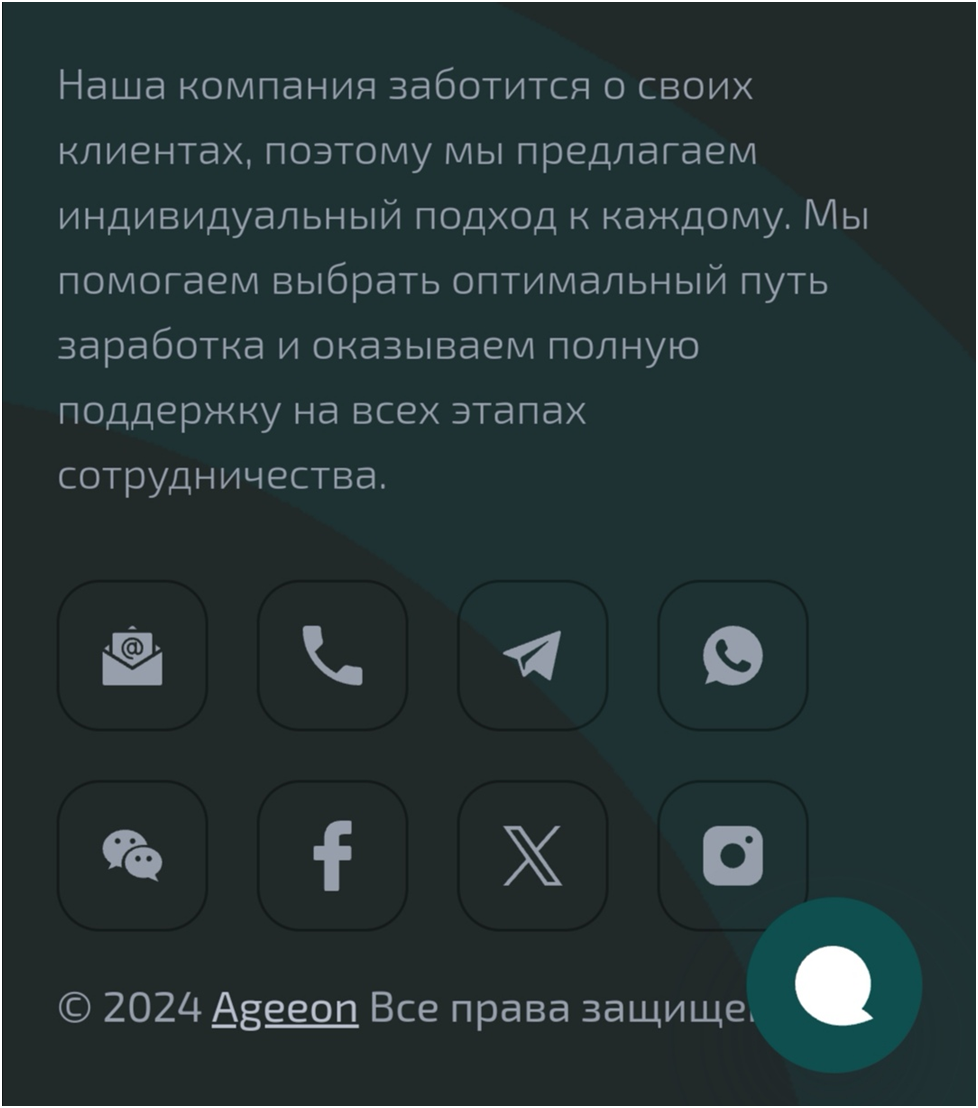 Домен Ageeon Com зарегистрирован в 2024 году. Сайт компании переведен на 28 языков, основным является английский. Представлена контактная информация: телефон – 19059191696, Телеграмм – AgeeonBot, который называется Ageeon assistant. Также указана ссылка на Facebook, Twitter и Instagram организации. Есть форма связи с поддержкой.