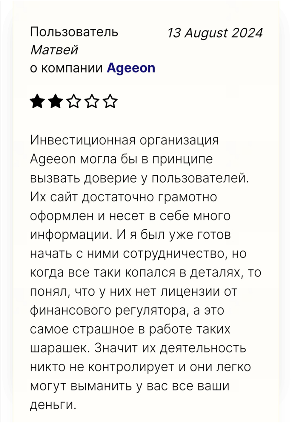 Мы изучили информацию о брокере «Агееон», и нашли следующие признаки развода: