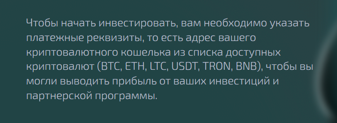 Пополнить баланс в личном кабинете можно с любого электронного кошелька, например, Binance Chain, Tron, Eth, Bnb, Ltc и т.д. Деньги принимаются только в долларах и криптовалюте. Все платежные транзакции обрабатываются моментально.