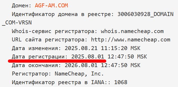 По данным проверки домен брокера agf am com зарегистрирован в начале августа, хотя компания заявляет о большом опыте работы.