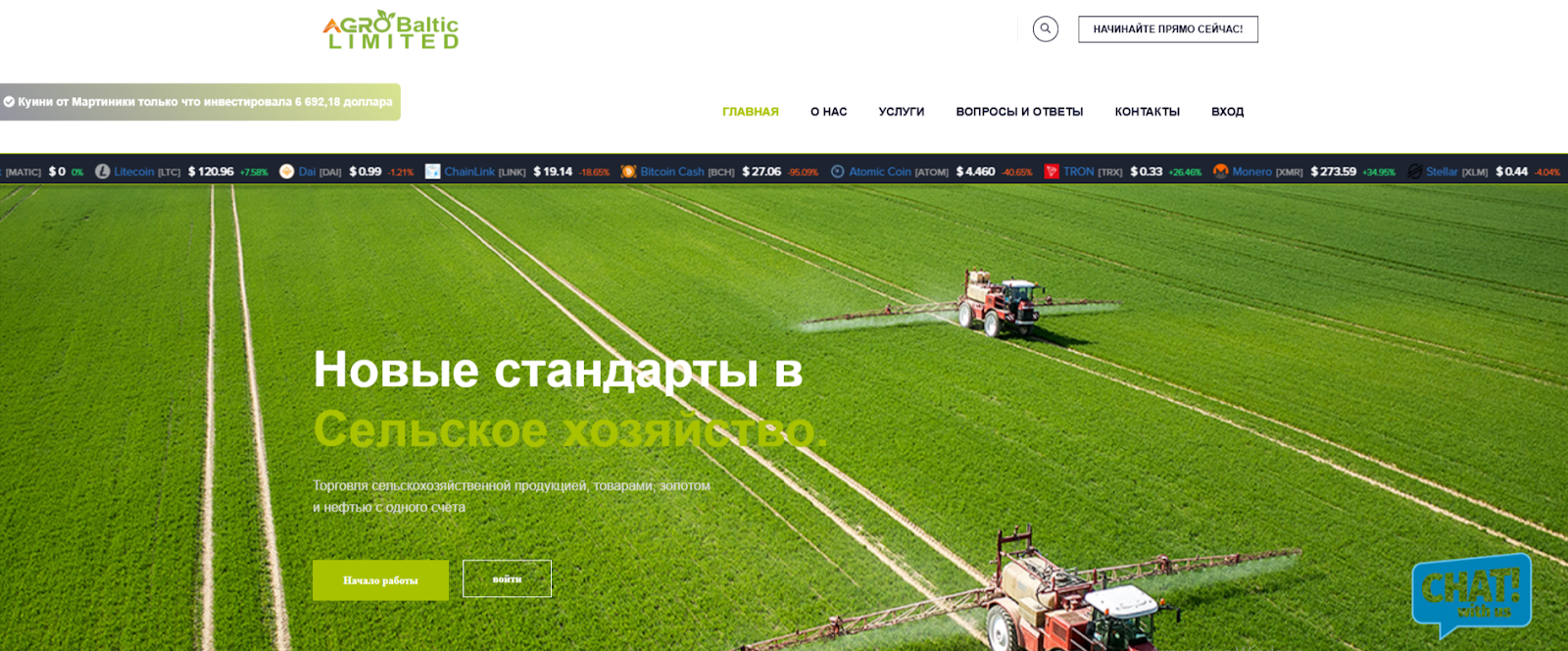 Agrobaltic — это брокерская компания, которая предлагает выгодные инвестиции в различные сферы. Клиенты могут вкладывать средства в сельское хозяйство, металлы, сырье и прочие активы. Создатели проекта заявляют о высоком доходе и инновационных решениях для удобства инвесторов.