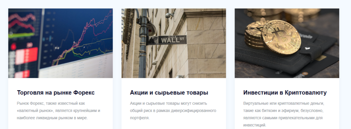 На сайте есть отдельный раздел, в котором потенциальные инвесторы могут узнать о направлениях вложений через этого брокера. Работать пользователи смогут с такими инструментами: