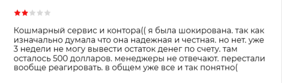 В следующем сообщении речь идет о краже средств работниками финтех-площадки. Юзер говорит, что уже несколько недель не может вывести деньги, а саппорт на жалобы не реагирует.