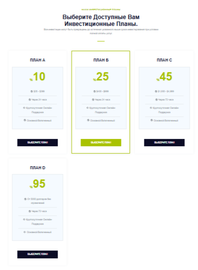 - План D — сумма пополнения от $5000. Юзер получит 95% от суммы внесенных средств через 72 часа.