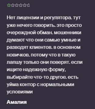 В одном из фидбеков пользователь говорит, что изначально понятно, кому принадлежит контора. Работающие без лицензий проекты — это платформы аферистов, которые скамят своих клиентов.