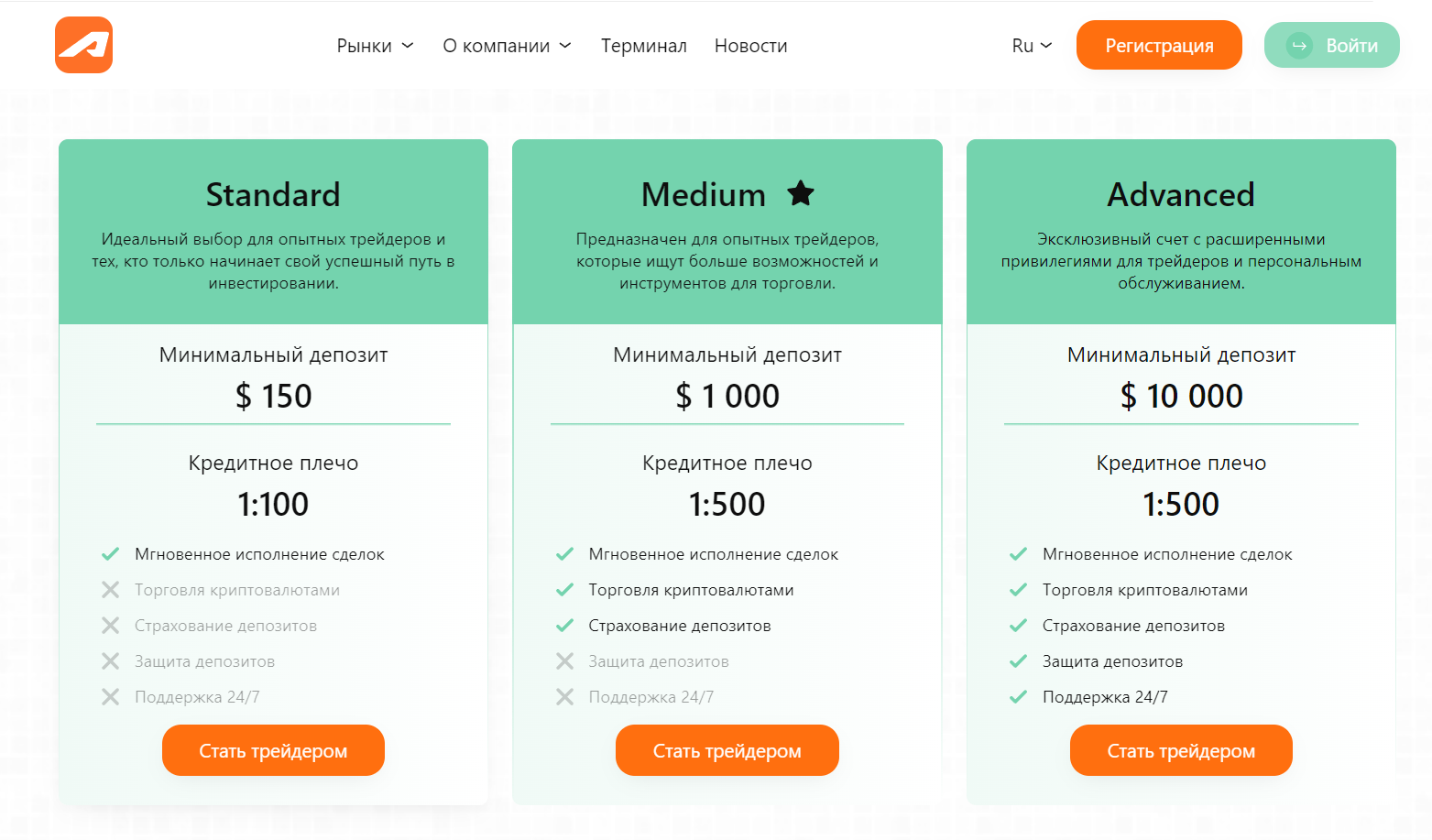 Для приумножения инвестиций Aipex Corp предлагает три вида счетов. Наименьшее кредитное плечо составляет 1:100. Как указано на сайте биржи Aipex Corp такой вариант подойдет начинающим инвесторам. Для более опытных трейдеров есть варианты с минимальным депозитом в тысячу и 10 тысяч долларов.