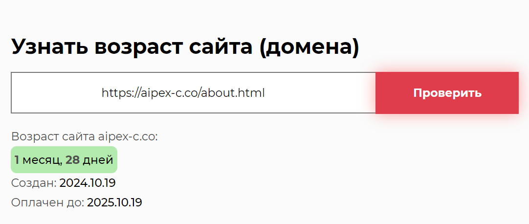 Возрасту компании традиционно должно соответствовать время создания ее сайта. К сожалению, при проверке выясняется, что aipex c co создан в октябре 2024 года. Это говорит о том, что брокер вводит в заблуждение своих клиентов, пытаясь создать для биржи Aipex Corp образ надежной компании. Также стоит заметить, что у проекта есть сайт aipexcorp com. Наличие сразу двух доменов вызывает подозрения. Поскольку такой прием используют фейковые организации. Это делается для подстраховки на случай блокировки одного из сайтов.