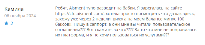 Все рассказы менеджеров об использовании ИИ, а также о том, что брокер предоставляет хорошие условия для инвесторов – фейк. Инвестировать в Aisment однозначно не стоит. Пользователи просто не смогут вывести свои деньги с этой платформы.