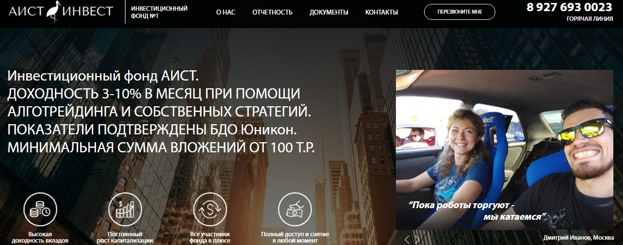 Платформа Аист Инвест, отзывы о которой неоднозначные, предлагает пассивную инвестиционную деятельность для каждого пользователя вне зависимости от первоначального депозита. Владелец финансового проекта Игорь Шепелев обещает аудитории, что зарабатывать на микро бирже несложно — достаточно лишь работать с его профессиональной командой. По традиции «жанра» верифицированную настоящую статистику успешных сделок никто не демонстрирует.