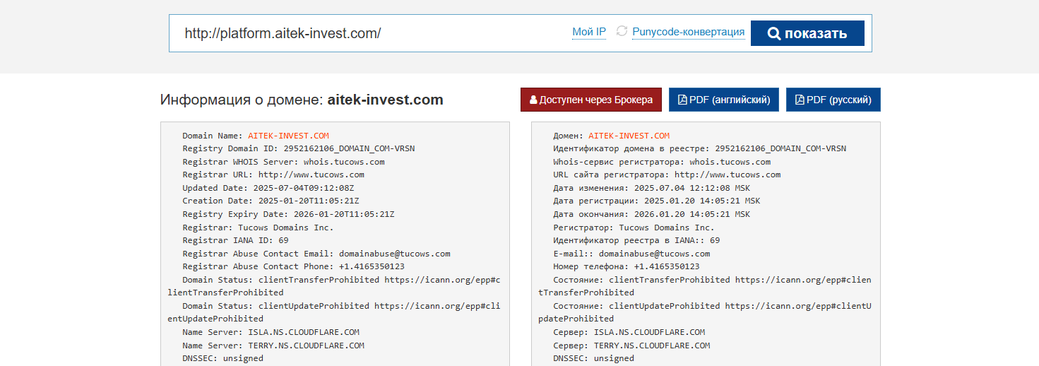 Главная страница проекта, Aitek Invest com, а также торговый терминал, который реализован на домене Platform Aitek Invest com были созданы в 2025 году, а последний раз адрес продавался в начале июля. Это означает, что брокер начал предлагать свои услуги лишь месяц назад, а при создании сайта они использовали одноразовые почты и телефоны, что вызывает сомнения.