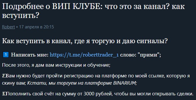 Платные услуги Роберт не оказывает, деньги ни за что не просит. Чтобы попасть на его обучение или получить доступ к сигналам, достаточно зарегистрироваться у брокера Binarium или Pocket Option и внести депозит от 3000 рублей.