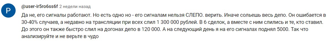 Роберт не размещает ни на одном из своих каналов убедительную статистику по итогам торговли. При этом постоянно рассказывает о том, как зарабатывает тысячи долларов сс каждой торговой сессии. В типичной для мошенников манере скрывает лицо, на видео появляется только в маске.