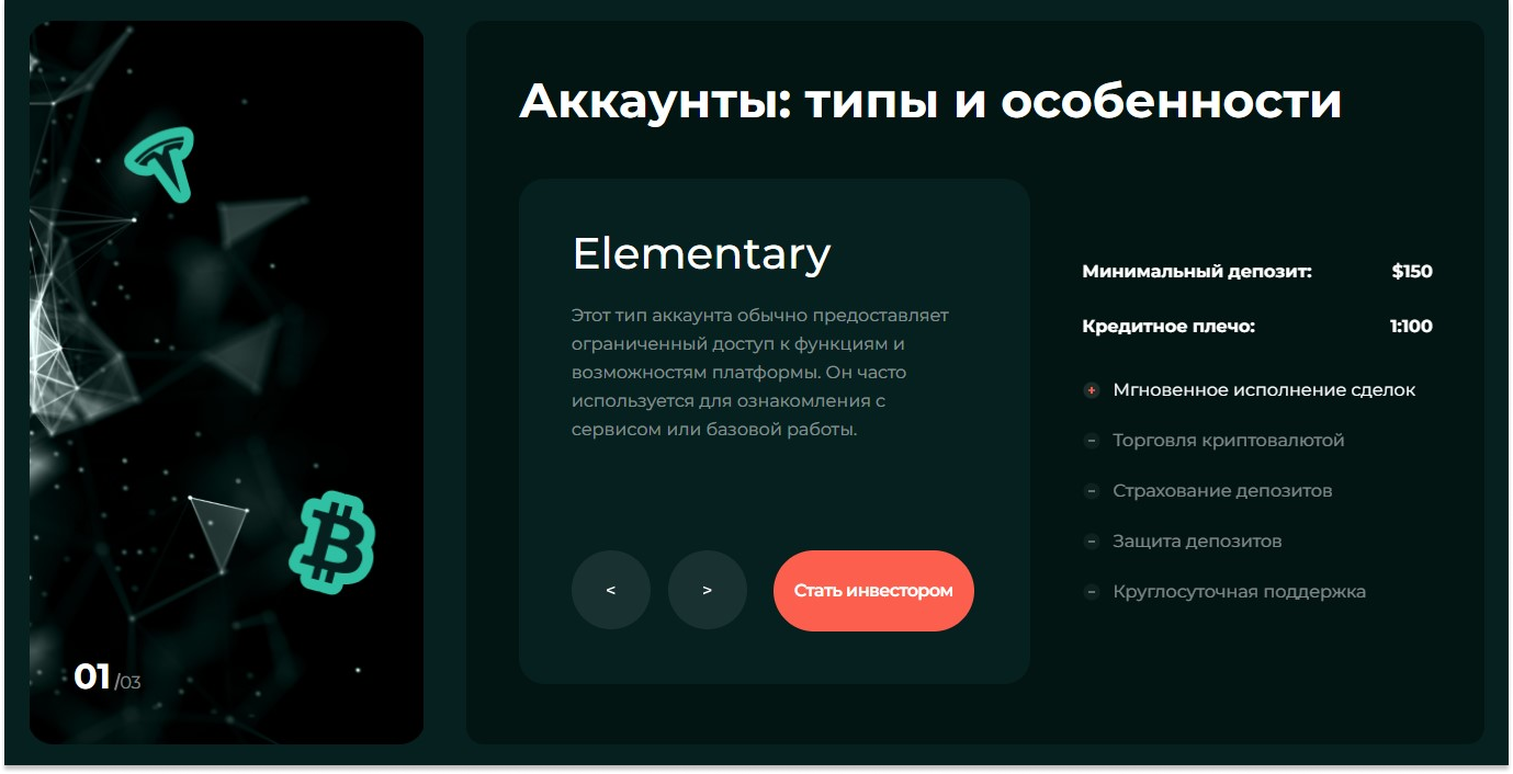 Условия сотрудничества доступны каждому желающему, и дело не в ценовой политике, а в открытых сведениях: про типы аккаунтов можно узнать на главной странице. Ценовая политика здесь как раз никого не щадит, ведь базовый аккаунт без страхования и бота поддержки функционирует со 150$, меньше этой суммы занести просто нельзя.