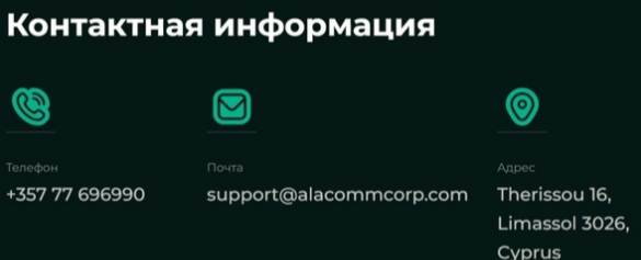 - Ложные заявления о регистрации: мошенники часто утверждают, что AlacommCorp работает в Европе, предоставляя фиктивные адреса, которые легко опровергаются через гугл-карты.