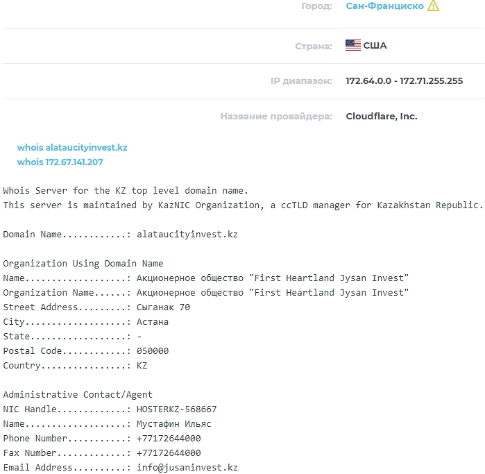 Ресурс создан 28.05.2025 неким Ильясом Мустафиным, и принадлежит организации в Астане First HeartLand Jusan Invest. Сервера обслуживает провайдер из США CloudFlare, что может говорить о выводе деятельности в оффшоры.