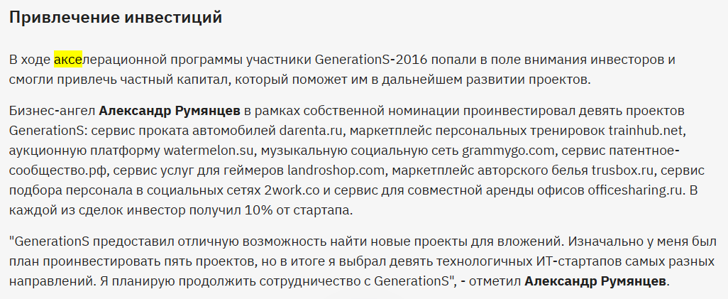 «ТАСС» информирует, что Румянцев проинвестировал 9 проектов, среди которых сервис проката автомобилей, социальная сеть, маркетплейс и сервис подбора персонала. Мы видим подтверждение того, что человек действительно вкладывает свои деньги в начинающие и перспективные бизнесы.
