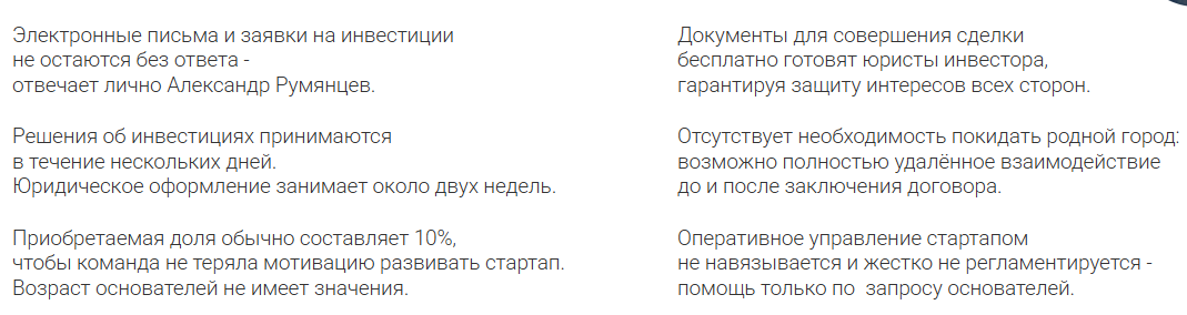 На сайте инвестора Александра Румянцева каждый предприниматель имеет возможность подать заявку на получение финансирования. Если его проект заинтересует данного «бизнес-ангела», он готов приобрести долю в его компании, обеспечив таким образом приток инвестиций. Сейчас мы выясним, каковы условия сотрудничества с меценатом и заслуживает ли он доверия стартаперов.