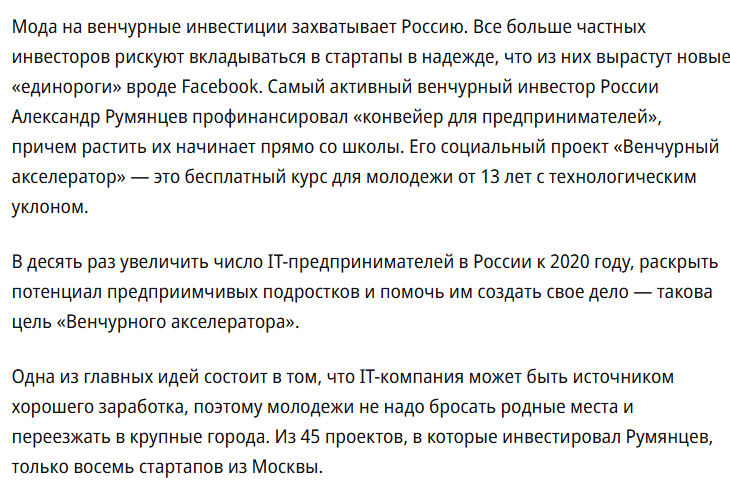 На лендинге Александра есть информация, что он был признан венчурным инвестором России №1 в 2016–2018 гг. Это не пустые слова: ссылка ведет на сайт РБК, где Румянцев действительно возглавляет топ «бизнес-ангелов». Эксперт доказывает наличие у него заявленных «регалий», что вызывает доверие.