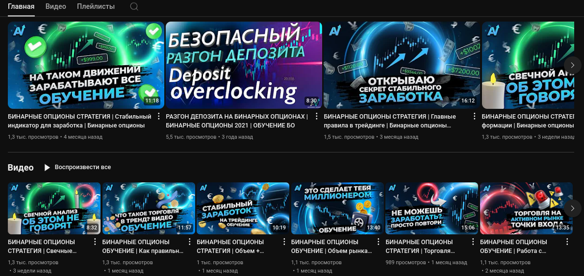 Всего опубликовано более 300 видео. Сегментация контента вполне привычная — обзорные видео, рекламные разборы бинарных опционов, разгон депозита и стратегии. Есть еще что-то похожее на обучение.