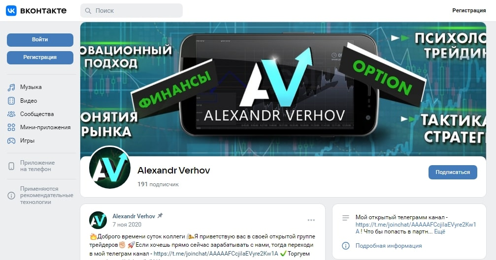 Трейдер Александр Верхов активно ведет несколько социальных сетей и паблик в мессенджере. Касательно последнего, вещание про финансовую работу осуществляется с 2 октября 2019 года. За это время аудитория телеграм-канала выросла незначительно — до чуть более 1 тысячи человек. Ознакомительной публикации Александр не оставил, есть базовое описание проекта без детальной аргументации, почему стоит его использовать.