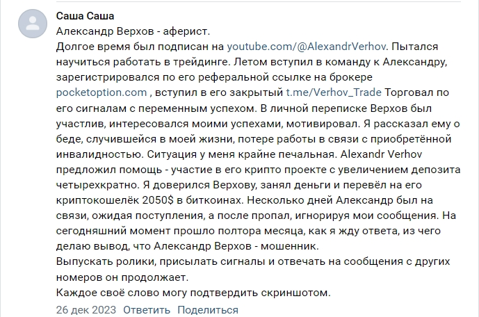 На внутренних ресурсах трейдер проекта Александр Верхов трейд размещает только положительную обратную связь от довольных клиентов. На самом деле репутация у деятеля отрицательная — на независимых платформах есть только негативные фидбеки. В них подписчики называют трейдера и инвестора мошенником, а его детище разводом.