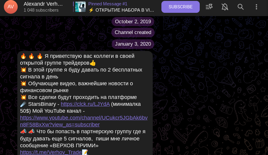 В публикации, похожей на пост-знакомство, которая появилась 3 января 2020 года, сказано о применении определенной биржи. Трейдер Александр Верхов отмечает, что надо регистрироваться на StarsBinary и тем, кто зарегистрируется по партнерской ссылке, админ предоставит 5 торговых сигналов.
