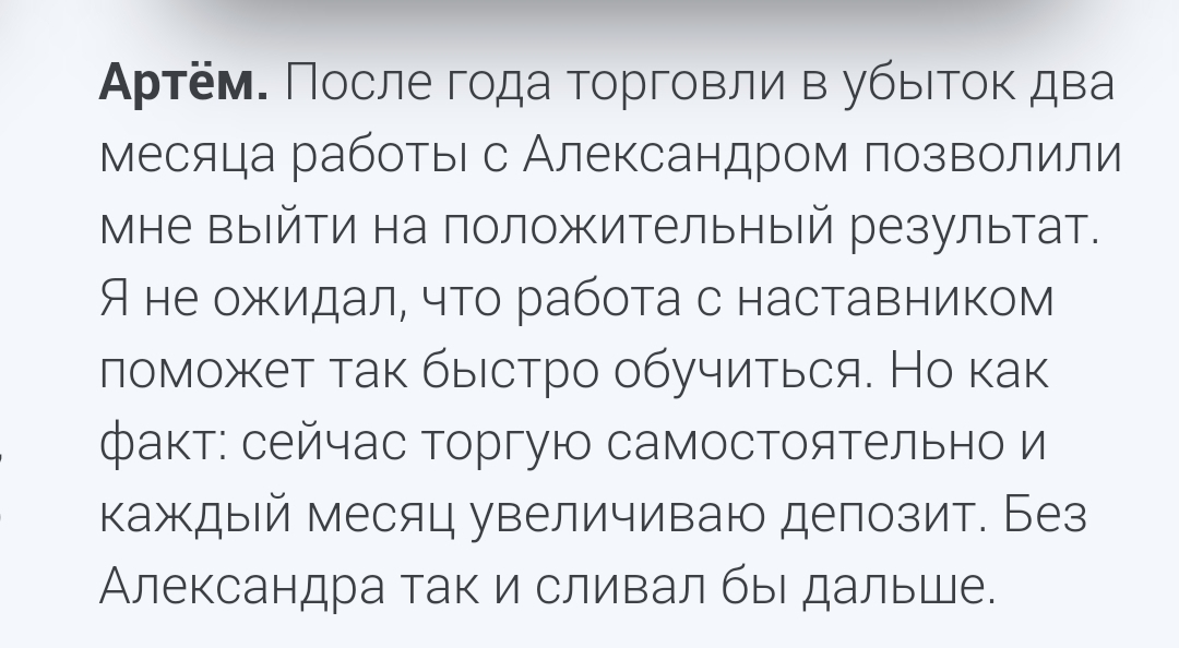 Оба комментатора довольны и отзываются об Александре как о хорошем педагоге-наставнике, который привел их к успешной торговле и получению денег.
