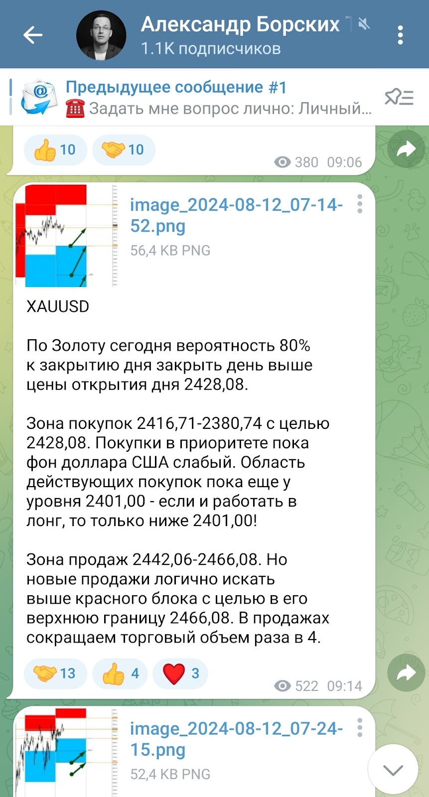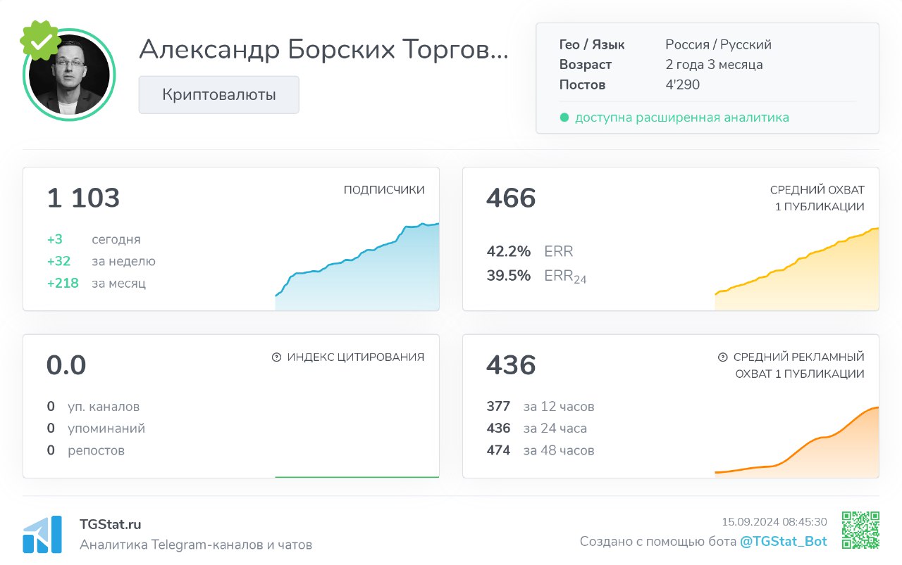 На некоторых ресурсах число подписчиков Александра не доходит и до нескольких сотен. Рекордсменомом по их числу является Телеграмм: в нём трейдера читают больше 1100 человек. А вот и статистика канала: