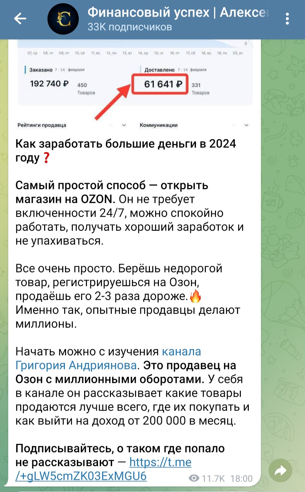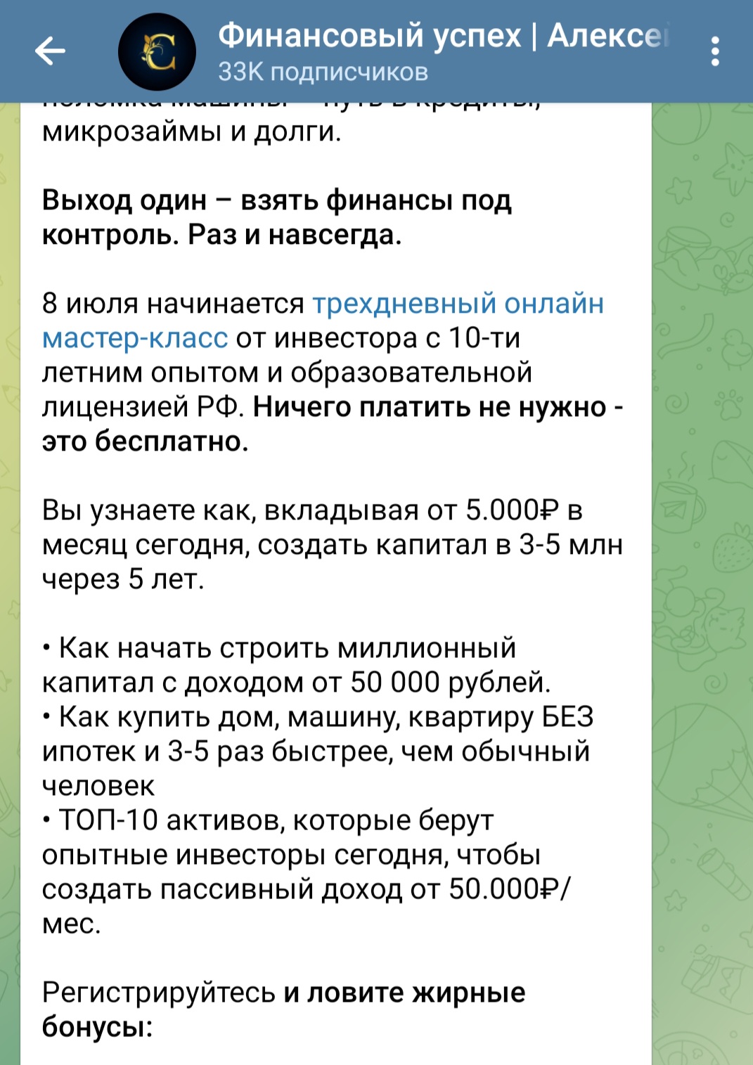 В ленте не было найдено приглашений на авторские курсы, раскрутку депозита и т.п. Выкладывается информационно-аналитический контент. При этом было замечено, что Алексей продвигает каналы, мастер-классы и вебинары других авторов. Возможно, с этой целью и было создано его сообщество.