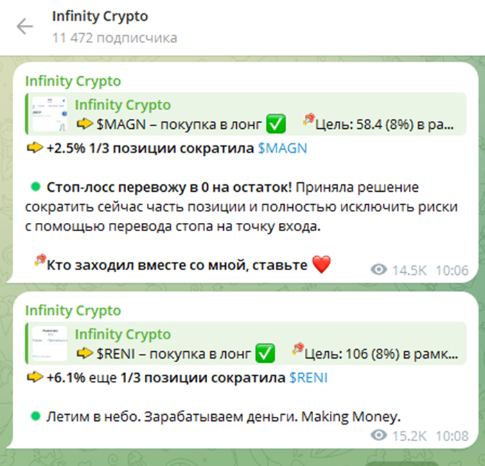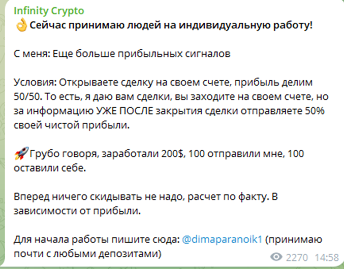 Теперь трейдер на канале Infinity Crypto предлагает совместное инвестирование. Услуга подразумевает торговлю на рекомендованной площадке. Клиент регистрируется, пополняет счет и торгует по сигналам Dimaparanoik1. Его выгода – 50% от прибыли.