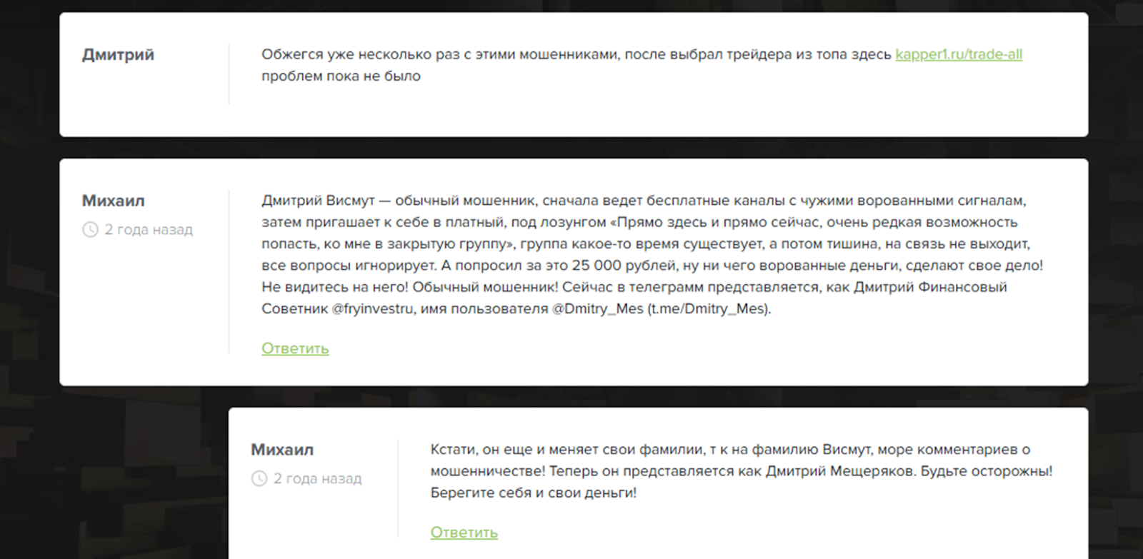 Люди жалуются, что он обманул их и рекомендуют держаться подальше от проектов лже-трейдера.