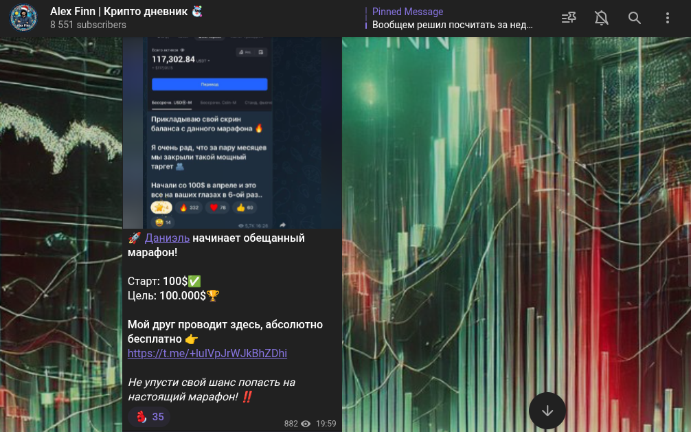 «Alex Finn Крипто Дневник» — телеграм-канал, где подписчики получают авторские рекомендации от Алекса, чтобы покупать и продавать активы для плюс к прибыли. Помимо этого, якобы профессиональный трейдер гарантирует, что каждый пользователь будет зарабатывать деньги, используя лучшие торговые сигналы и качественный авторский подход.