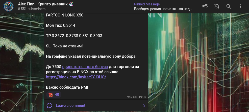 На телеграм-канале «Alex Finn Крипто Дневник» Алекс постит публикации с бесплатными торговыми сигналами. Помимо этого, эксперт разбавляет контент якобы личными наблюдениями.