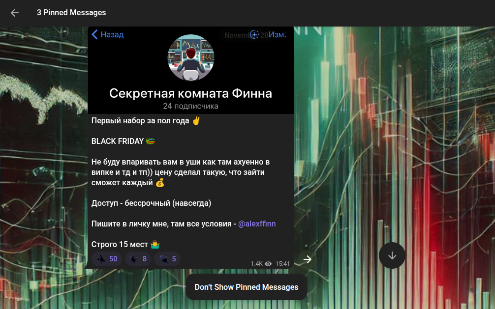 Стоимость VIP-доступа к закрытому ТГ «Секретная команда Финна» автор в открытом доступе не разглашает. Чтобы узнать прайс, надо написать в ЛС автору сообщества. Однако известно, что в рамках випки подписчики получают уникальные торговые сигналы, которые гарантированно принесут плюс к прибыли.